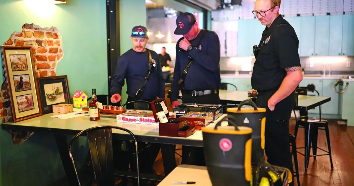 Salida firefighters, from left, Dillon Mackey, Dan Distel and Tyler Oster look at silent auction items for the Tom Marcello Scholarship Fund fundraiser Oct. 25 at Amicas. The fundraiser made $1,699 for local high school scholarships.