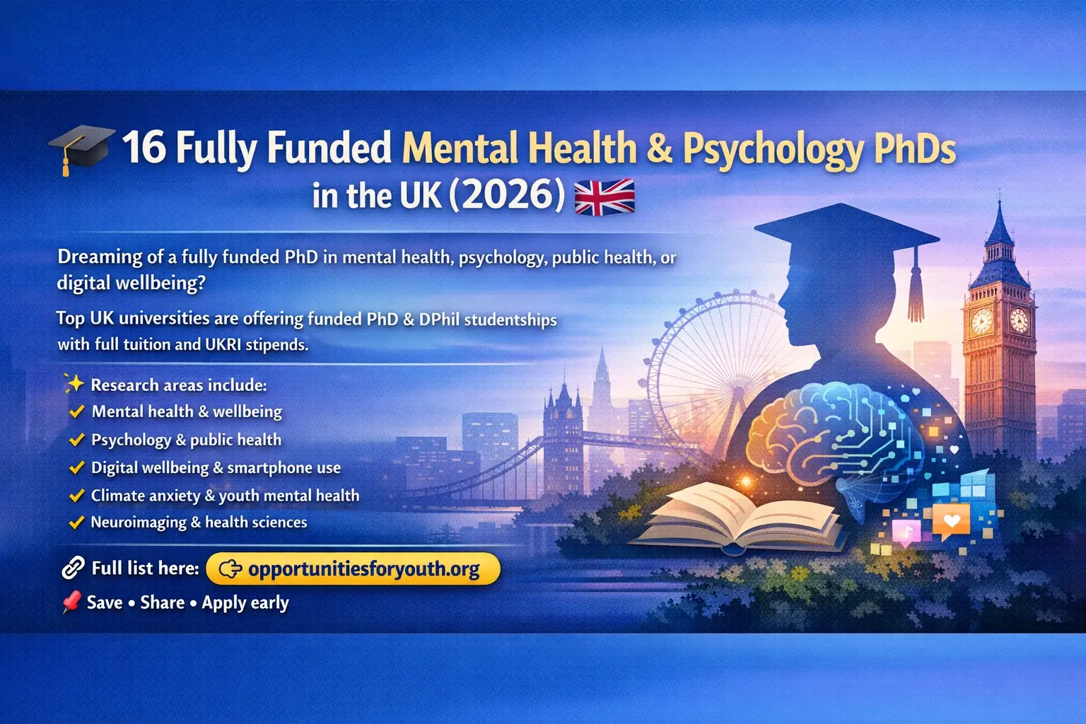 This curated list features 16 funded PhD and DPhil studentships across public health, mental health, psychology, digital wellbeing, nutrition, climate action, economics, and social sciences, offered by leading UK universities.