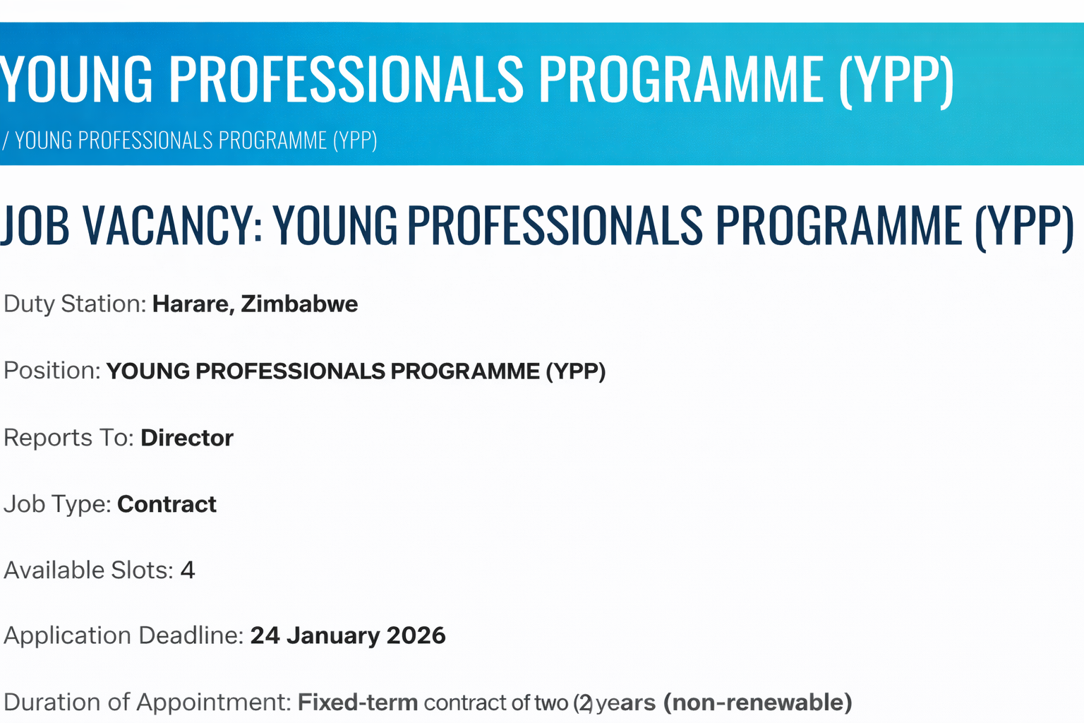 Duty Station: Harare, Zimbabwe Position: YOUNG PROFESSIONALS PROGRAMME (YPP) Reports To: Director Job Type: Contract Available Slots: 4 Application Deadline: 24 January 2026 Duration of Appointment: Fixed-term