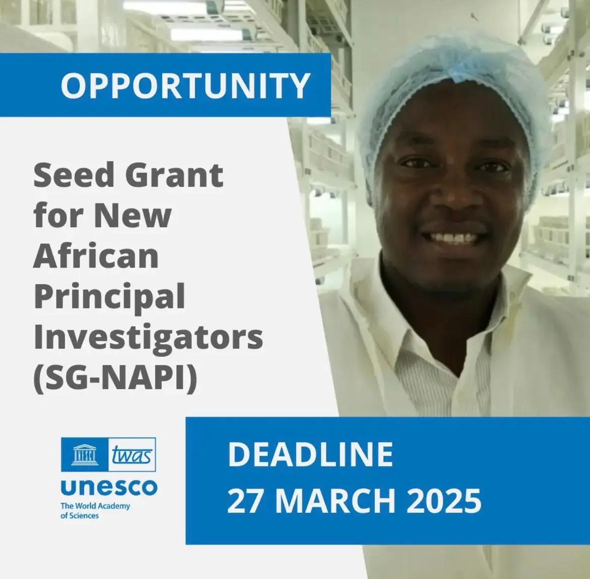 The Seed Grant for New African Principal Investigators (SG-NAPI) is a prestigious research funding opportunity designed to strengthen scientific research capacity in African countries that are lagging in science and technology. The Seed Grant for New African Principal Investigators (SG-NAPI) was launched by UNESCO-TWAS with the financial support of the German Federal Ministry of Research, Technology and Space (BMFTR).